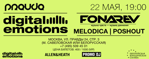 Новый сезон вечеринок «Digital Emotions» исследует данную парадигму и дает несколько важных вводных. Во-первых, вечеринки сдвигаются на вечер: с 19:00 до 00:00, целых пять часов классического звучания в комфортных условиях. Выступают все без исключения резиденты лейбла. Каждый из них берет на вооружение передовые технологии (как железо в виде контроллеров, так и софт), расширяет само понимание живого диджейского выступления, подключая в режиме реального времени синтезаторы. Все это для того, чтобы в обновленных форматах создавать эдиты легендарных треков, накопившихся в классических жанрах прогрессив, транс, псай-прогрессив. Плюс презентация новых релизов лейбла.