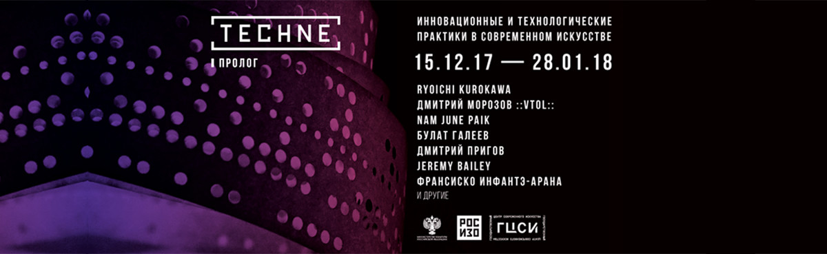 Techne. Пролог — первое событие выставочной платформы Techne, посвященного инновационным и технологическим практикам в современном искусстве. Основная идея — живая интеграция понятия «технологическое искусство» в современный культурный контекст и непрерывное создание новых произведений. Куратор выставочной платформы — Natalia Fuchs , сокуратор — Antonio Geusa, продюсер — Знаменский Дмитрий.