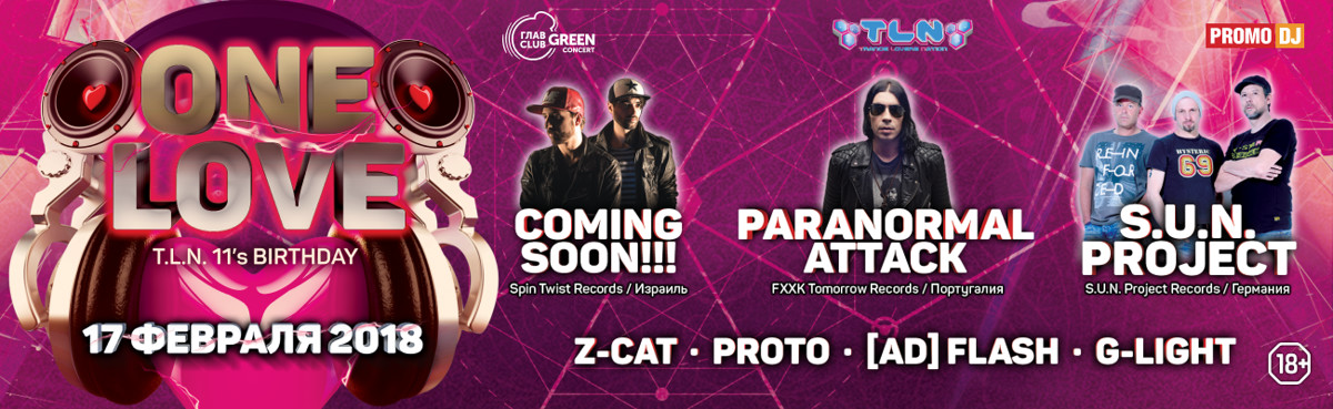T.L.N. Promotion представляют One Love 17 февраля 2018 года в ГлавClub Green — грандиозное празднование двух значимых событий в мире столичной электронной музыки. В этот день здесь встречают День Святого Валентина, а также празднуют 11-летие команды T.L.N.