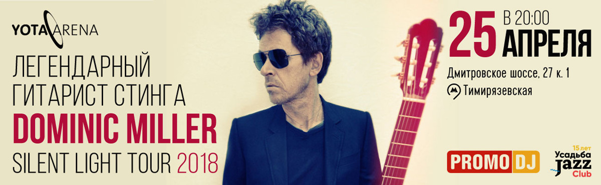 25 апреля в Yota Arena выступит легендарный гитарист Стинга Dominic Miller в рамках Silent Light Tour 2018 с программой, состоящей из новых песен, а также таких хитов, как: Yes, Shape Of My Heart, La Belle Dame Sans Regrets, World Is Running Down, Fields Of Gold.
