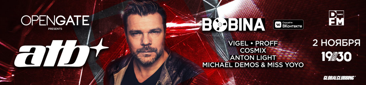 За более чем 20-летнюю карьеру он выпустил 10 студийных альбомов, три из которых стали платиновыми. ATB — один из первых диджеев, чья популярность вышла за пределы электронной сцены. Начиная с середины 90-х он возглавлял мировые чарты с хитами 9 PM (Till I Come), Ecstasy, Apollo Road и Let U Go. Локальную поддержку окажут: Bobina с сетом из нового материала и классики, а также Vigel, Proff, Cosmix и Anton Light.
