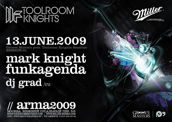 Вместо того чтобы найти один стиль и обрести постоянство, господин Марк Найт старается насыщать свои сеты как можно большим количеством разнообразной музыки. Он любит не только стирать границы (между музыкальными измерениями), но и пересекать их - 42 страны (Сингапур, Голландия, Ирландия, Болгария, Германия, Словения, США ) за 12 месяцев и около 20 концертов за 30 дней. На этот раз с городом Москва в своем гастрольном графике! 13 июня в Arma09 вечеринка «Toolroom Knights» - постановочное дэнс-шоу, самые красивые go-go girls двух столиц, специальные декорации и визуально насыщенный перфоманс в соответствии с настоящим британским стандартом качества! А также возможность скачать по Bluetooth эксклюзивный контент от приверженца новейших технологий Toolroom Records прямо во время сэта!