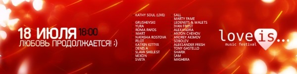 Шаг первый сделан. 30 июня в яхт-клубе Адмирал прошел первый в серии фестиваль Love Is... Music Festival. Теория любви была преподана на отлично, несмотря на не очень дружелюбную погоду ночью, гости не разочаровались в выборе места отдыха. И даже вездесущий кризис не смог помешать развлечься так, чтобы на утро не помнить ничего, кроме двенадцатичасового веселья. Но, как говорят организаторы, это была всего лишь теория. А 18 июля, все в том же яхт-клубе Адмирал, команда Медиадрайв Промо устраивает практику. Практику в любви, веселье и отличной музыке.