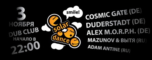 После полугодового перерыва праздник солнца и любимой музыки возвращается в город, даря улыбки и хорошее настроение. Rise Up Production и компания Antil рады представить вам четвертое мероприятие из серии фестивалей Solar Dance! Дружественная атмосфера solar people, светлая и поднимающая вверх руки музыка, небольшой уютный клуб при участии всемирно известных диджеев и продюссеров танцевальной электронной музыки — вот формат и концепция «солнечных танцев».