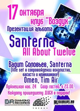 В октябре компания Diamond Records выпускает дебютный альбом молодого талантливого музыканта Santerna (Александр Девятьяров) — All About Twelve. По этому случаю 17 октября в клубе «Воздух» состоится презентация. Центральным событием вечера станет живое выступление Santerna в сопровождении вокалистки, басиста и клавишника. Live-set — это возможность услышать лучшие работы с диска в исполнении полноценного квартета. Это не музыка с болванок, она будет создаваться в режиме реального времени на глазах у присутствующих. Окунитесь в магию творчества. Живое выступление дополнят сеты известных российских диджеев, чье выступление в столице — событие.
