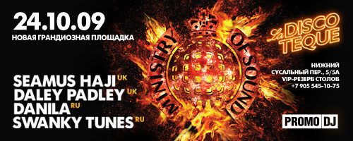Свою резиденцию в Discoteque московское представительство Ministry Of Sound начинает с тузов британской хаус-элиты — владельца очень респектабельного хаус-лейбла, журналиста и музыкального критика Seamus Haji, у которого в лондонском Ministry Of Sound на постоянной основе проходят собственные вечеринки. Вместе с ним веселое и непринужденное хаус-звучание будет демонстрировать молодое дарование по имени Daley Padley, который также является резидентом MOS.