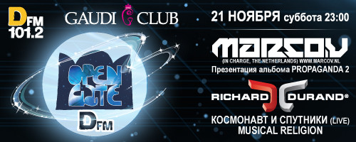 Голландец Marco V презентует в Gaudi четвертый артистический альбом Propaganda Part 2. В этой работе Марко Веркуйлен открылся с неожиданной стороны: в его фирменный “замес” из транса, хауса и техно добавились элементы psy-звучания. Ричард Дюранд дебютирует в Москве с альбомом Always The Sun. Этот легко управляющийся одновременно с четырьмя вертушками диджей является ярчайшим представителем транс-музыкантов новой волны. Третья премьера — уже российская. Свой первый в артистической карьере альбом — Prologue — представят Петр Щетанов и Алексей Дьяконов из Musical Religion. Этих в высшей степени перспективных артистов знают уже неплохо — в основном по бесконечным гастролям и хедлайнерским сетам на фестивале “КаZантип”.