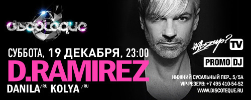 Впервые за три года услышать «нового» D. Ramirez московская публика сможет только на фирменной вечеринке Feel The House клуба Discoteque. Можно смело заявить, что это третье рождение музыканта. Давний друг Энтони Паппа, Deep Dish, Meat Katie, Пита Тонга и Джона Дигвида будет полноправным хедлайнером ночи. Помогать ему будут лучшие столичные силы хаус-музыки — DJ Danila, музыкальный директор и резидент Discoteque, а также DJ Kolya.