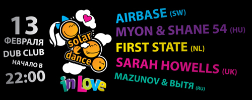 Rise Up при тесной поддержке компании Antil представляет вашему внимаю мероприятие в канун всемирного дня влюбленных, почти в самом горячем месте Москвы. Встречайте всесезонный фестиваль солнца, радости и любимой музыки Solar Dance. Пятое мероприятие из серии «солнечных танцев» пройдет 13 февраля под сводами заводского цеха Dub Club с лозунгом «wanna fall in love!», ведь только любовь к музыке объединяет столь огромное количество совершенно разных людей со всего света.