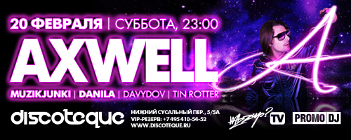 20 февраля клуб Discoteque сделает большой шаг к тому, чтобы навсегда изменить представление о московской клубной индустрии. В эту ночь в пространстве московского клуба выступит суперзвезда мировой клубной сцены Axwell.