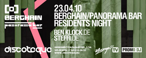 23 апреля в клубе Discoteque пройдет традиционное мероприятие Berghain/Panorama Bar Residents Night. На первых трех вечеринках выступило целое созвездие лучших техно-диджеев Европы, среди которых Shed, Nick Hoppner, Marcel Dettmann, ND Baumecker и Radioslave.
