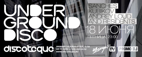 В пятницу, 18 июня, гостям Discoteque, который совсем недавно был признан «Открытием года» по версии Night Life Awards 2009, предстанет трио разных, но по-своему интересных диджеев: именитый и имеющий опыт выступлений в Discoteque — Andrey Loud, а также Санчес&Кубиков — культовый супер-дуэт, с годами лишь набирающий обороты.