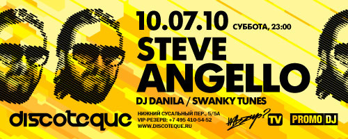 Только 10 июля, только в клубе Discoteque — Steve Angello! Вместе со знаменитым Steve Angelo на сцене Discoteque выступят Danila, резиденты Discoteque и известный российский проект Swanky Tunes.