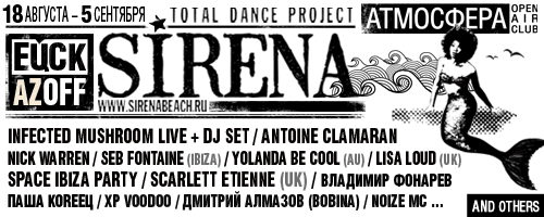 Место действия — Краснодарский край, побережье Азовского моря, город Ейск. На 18 дней курортный город превратится в центр танцевальной жизни. Тысячи поклонников танцевальной культуры будут отрываться на побережье под сеты именитых диджеев, которые съедутся в край со всех мировых танцполов. Резиденты фестиваля Sirena: Infected Mushroom, Yolanda Be Cool «We No Speak Americano», Lisa Loud, Nick Warren, Seb Fontaine, Владимир Фонарев, Дмитрий Алмазов, DJ Danila , DJ Fish, Паша Коreeц, XP Voodoo, DJ List, Helga, Prosha, Дeцл, Копы в Огне , Noize MC , DJ Спирин, DJ Тая Катюша, Suhov, Viper, Polina, Solid Sky, Алекcандр Мелодика, Игорь Кокс, DJ Карась, DJ Fisun, Большая Танцевальная Мышь (БТМ), DJ Duhov, DJ Sanches, Bell, Djungl, Sapunov, Панда (Дабац), T9, Иракли, Света, Push’n’Pull, Kayla Caryapadas, Easy Changes, Demos & Yo Yo, Scarlett Etienne, Sonia, Grad и другие.