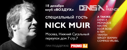 Но, несомненно, центром притяжения на этих мероприятиях всегда являются музыканты и диджеи. В разное время гостями этих уютных вечеров уже успели побывать: Robert Babicz, Beltek, Solaris Heights, Varoslav и многие другие. В этот раз, под сводами московского клуба «Воздух», главным приглашенным гостем будет легенда современной прогрессив-хаус сцены Nick Muir — человек, заслуги которого перед миром электронной музыки можно перечислять бесконечно.