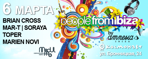 6 марта клуб «Космонавт» предоставляет уникальную возможность публике перед открытием сезона на Ибице почувствовать настоящий драйв и перенестись в жаркую Испанию. В рамках международного тура People From Ibiza By Amnesia в Петербурге выступят: Brian Cross — один из известнейших диджеев Испании, бессменный резидент Amnesia Ibiza и просто горячий испанский парень, достигнувший очень многого в музыкальной сфере; Soraya — сверхновая звезда мировой хаус-музыки, которая щедро делится с публикой своей страстью и бешеной энергетикой; Mar-T — продюсер, основатель звукозаписывающего лейбла Wow Recordings, самый завидный жених Испании по версии Maxim, музыкальный директор клуба Amnesia.