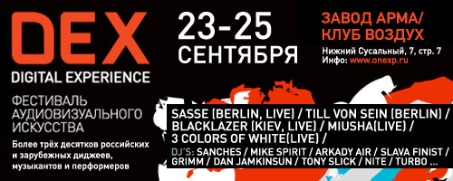 DEX — международный фестиваль цифрового искусства, представляет собой новый событийный жанр в сфере культурных мероприятий: edutainment, образование и развлечение, объединяет в себе выставку, вечеринку, конференцию, лекторий и маркет.