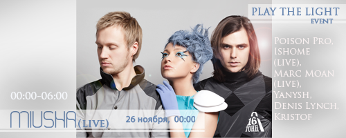 26 ноября в 00:00 стартует вечеринка Playing The Light — ночь красивой электронной танцевальной музыки. Лайв-шоу одного из самых загадочных электронных проектов столицы, закодированное в магическом миксе музыки и аудиовизуального искусства продолжится выступлением молодого дарования из Краснодара, волшебницы электронных полотен Ishome, успевшей покорить своими творениями не один зарубежный лейбл. Marc Moan — еще один талантливый ростовский музыкант, чьим творениям присуще редкое качество «качающей нежности» — его музыка, одновременно динамичная и мелонхоличная, не оставляет равнодушными всех, кто ищет в электронной музыке не просто движение, но подключение к сердцу.