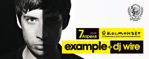 Example — прорыв последних лет на мировой сцене электронной музыки. Артист нового уровня, ставший кумиром для миллионов прогрессивных любителей качественного саунда. Его треки — это симбиоз самых актуальных тенденций в электронной культуре. Его синглы уже несколько раз становились платиновыми, а уникальный вокал стал узнаваемым во всех частях земного шара. Клипы на всех известнейших музыкальных телеканалах планеты. Ротация на крупнейших радиостанциях. Впервые в Санкт-Петербурге со своим безумным шоу!