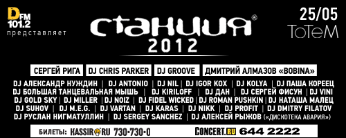 Chris Parker, DJ Groove, Дмитрий Алмазов, а также Сергей Рига станут главными хедлайнерами легендарного танцевального фестиваля «Станция 2012», который состоится 25 мая.