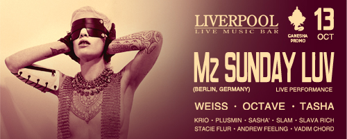 Во-первых, мы отмечаем День Рождения заслуженного деятеля искусств, основателя Ganesha Promo, диджея и промоутера Вадима Weiss’а. Во-вторых, только в эту ночь у Вас есть возможность услышать в одном месте сразу всех лучших диджеев города Донецка. И наконец, получить удовольствие от лайв перфоманса нашей гостьи из Берлина — Mz Sunday Luv.