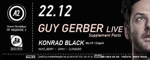 Как гастролирующий артист, Гай Гербер — желанный гость на крупнейших фестивалях по всему миру (MUTEK в Детройте, ADE в Нидерландах, Sonar в Барселоне, God’s Kitchen в Британии и других). Совместные туры с Richie Hawtin, Tiefschwarz и Matthew Johnson поставили его имя в ряд самых востребованных артистов мира. А шоукейсы его лейбла Supplement Facts, давно шагнули за пределы Израиля и сейчас проходят с невероятным успехом по всему миру от Южной Америки до самых культовых европейских клубов!