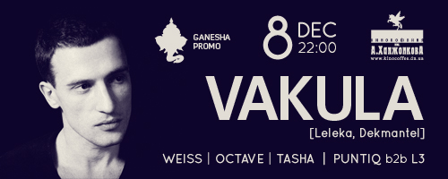 Vakula — ум, честь и совесть электронной сцены Украины. Артист, который за последние пять лет смог добиться безоговорочного международного признания и внимания со стороны авторитетных зарубежных критиков и музыкантов. Уникальный творческий почерк, глубокое понимание сути музыки, каждого звука, ощутимые в его композициях, возносят Vakula на тот недосягаемый для большинства электронных продюсеров уровень, где начинается настоящая магия. В миру Михаил Витюк, Vakula предстает в рядах своих современников едва ли не инопланетянином. Абсолютно не понятно, как его музыка рождается не то чтобы в городе Конотоп, но в конце нулевых — начале десятых, в принципе. Через него говорит история. Чикаго, Детройт, ранний хип-хоп, фри-джаз, вплоть до шаманских ритмов — в этой музыке можно раствориться без остатка.