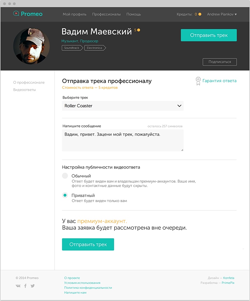 У нас нет какой-то премодерации. Основной фильтр Promeo — сама платность видео-ответов. Есть ограничение по длительности ответа — он должен быть не менее 30 секунд. Как правило, средний выходит на 4–6 минут, а есть и подробнейшие пятнадцатиминутные разборы от нашего рецензента Никиты Сталкера. Пользователи должны быть уверены, что получат грамотные, профессиональные и — главное — подробные обзоры на свои треки или миксы.