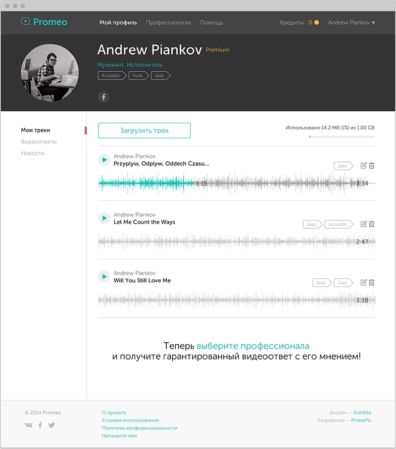 Будем откровенны, Promeo — это не ноу-хау. В США вот уже пять лет успешно работает аналогичный проект, объединивший более 400 профессионалов и 50 000 пользователей. Проблема в том, что этот сервис ориентирован только на Америку и только на хип-хоп. Мы же перенесли эту идею в Россию со многими дополнительными функциями и сделали Promeo «мультижанровым».
