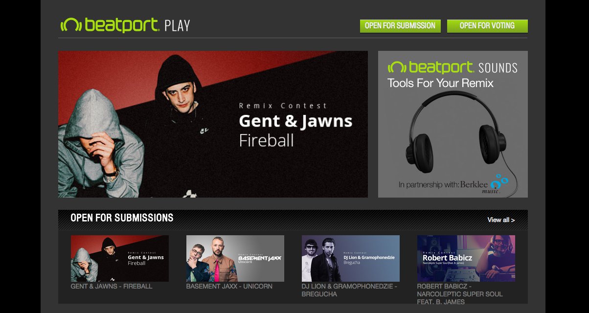 Заслуживает внимания и Beatport Play — раздел, посвященный конкурсам ремиксов. Он дает возможность создать ремикс, используя официальную студийную акапеллу от исполнителей. Правда существуют определенные ограничения, которые регулируют, на какие ресурсы и в течение какого срока вы имеете право загружать результаты — все зависит от правил проведения конкурса.