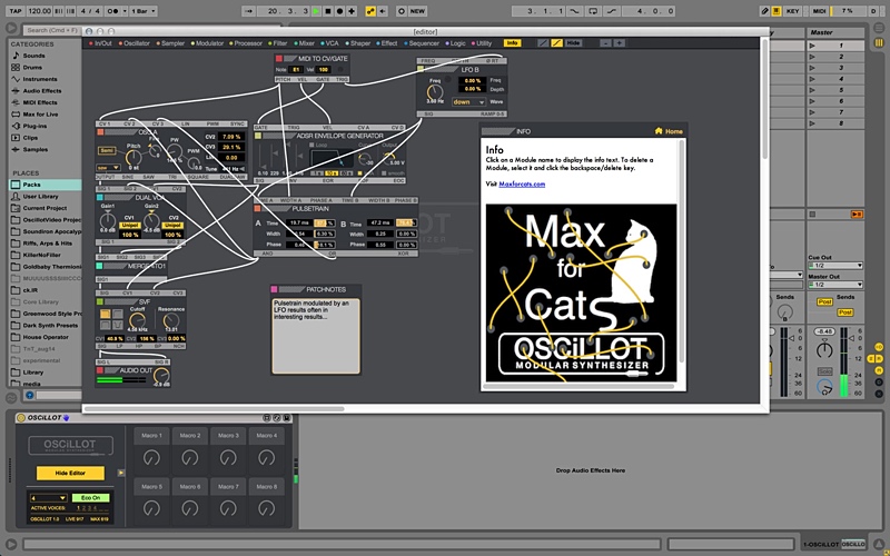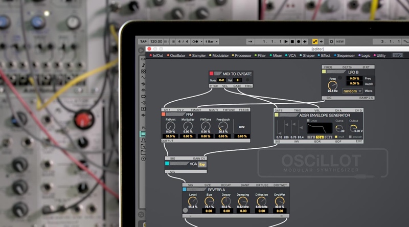 Но теперь модульный синтез становится частью системы Ableton Live благодаря OSCiLLOT, новому устройству в среде Max For Live. OSCiLLOT, разработанный в компании Max For Cats, предлагает пользователям Ableton сто обновляемых модулей (включая осцилляторы, фильтры, процессоры, микшеры, модуляторы, усилители, шейперы, секвенсоры, утилиты и так далее), которые можно коммутировать друг с другом в свободной последовательности, создавая таким образом уникальные аудиотракты для генерации звуков и манипулирования ими.