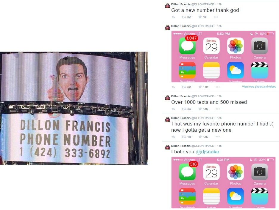 Один из самых забавных моментов фестиваля произошел на главной сцене благодаря DJ Snake. В лучших традициях дружеского троллинга Snake решил вывести на огромный экран личный номер телефона Диллона Фрэнсиса. Фэнам хватило пяти минут, чтобы засыпать папку со входящими сообщениями на телефоне Фрэнсиса под завязку. Диллон похвастался результатами в Твиттере: больше тысячи текстовых сообщений и пятиста пропущенных звонков. Могло быть больше — судя по всему, дальше смартфон просто разрядился.