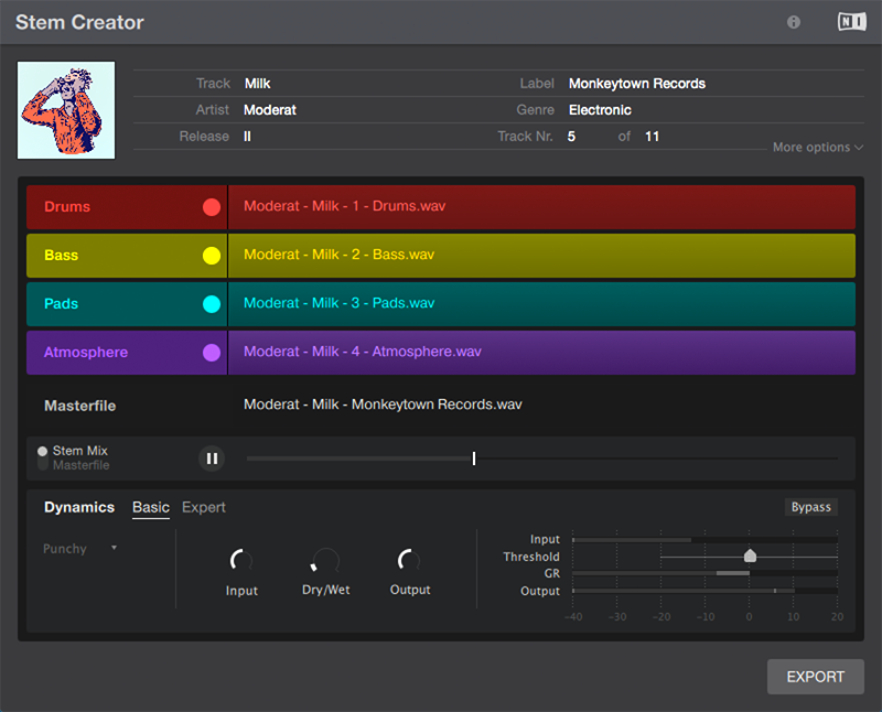 Итак, прежде всего пользователь должен импортировать в Creator Tool четыре отдельные дорожки, каждая из которых предварительно подготовлена (в виде отдельного аудиофайла) в аудиоредакторе или цифровой рабочей аудиостанции, а также добавить обычный стерео-мастер трека. После загрузки элементов можно отредактировать метаданные вроде имени «основы», названия альбома или цвета Stem-дорожки, а также заняться обработкой аудио. Для сбалансированного звучания можно наложить мастеринг-компрессию и лимитирование. После отстройки уровней компрессии и лимитирования, Stem Creator Tool упаковывает все «основы» в единый файл формата «.stem.mp4».