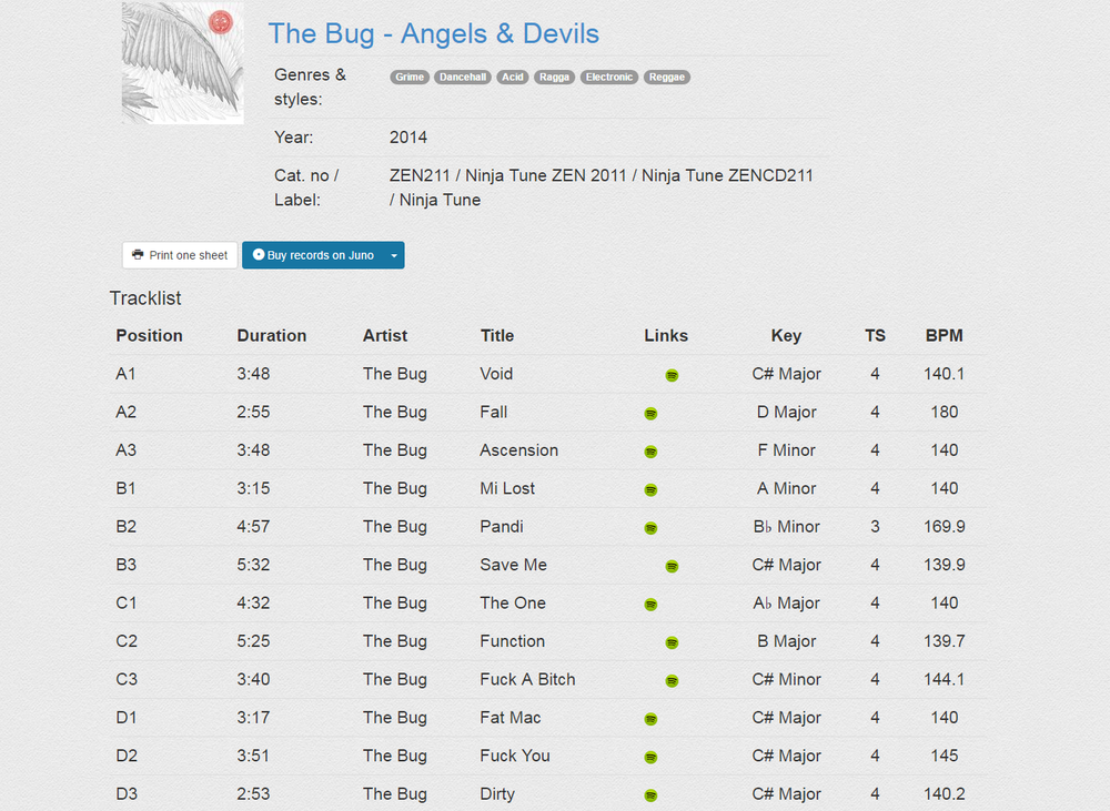 Достаточно вбить в строку поиска название релиза или ссылку на Discogs, и Disconest выдаст не только тональность, размер и количество ударов в минуту, но, по возможности, и ссылки на прослушивание через YouTube или Spotify, а также на покупку релиза в Juno. Сайт хорошо справляется с поставленной задачей, запинаясь только на самых малоизвестных или малораспространенных треках.