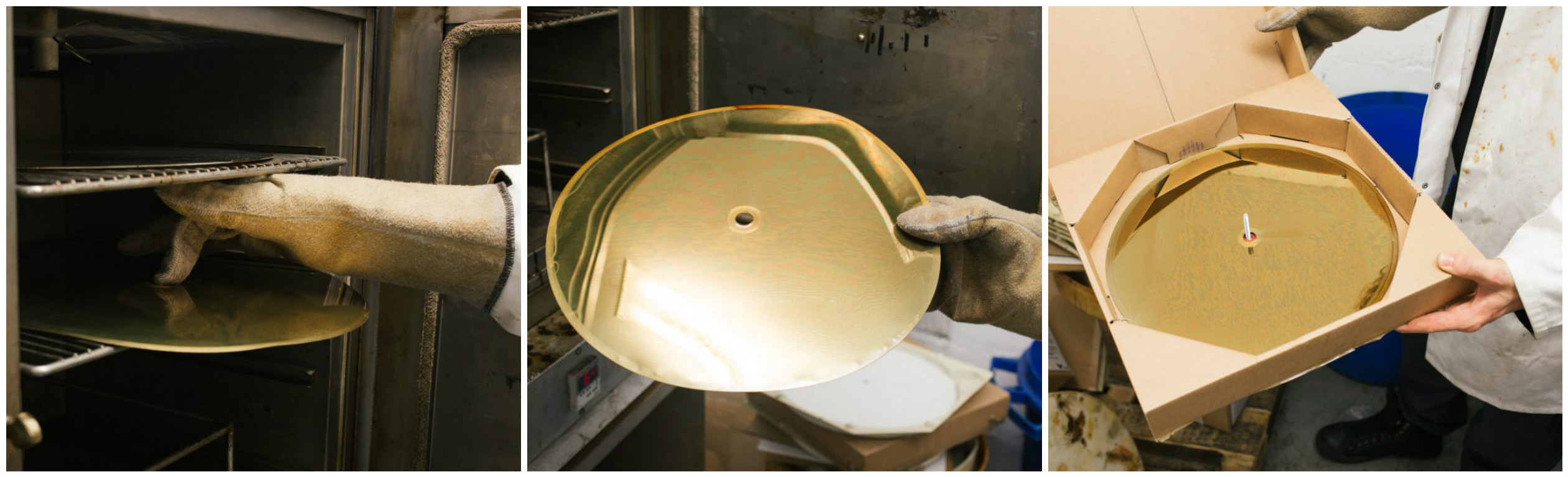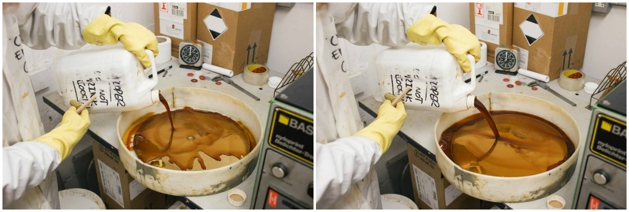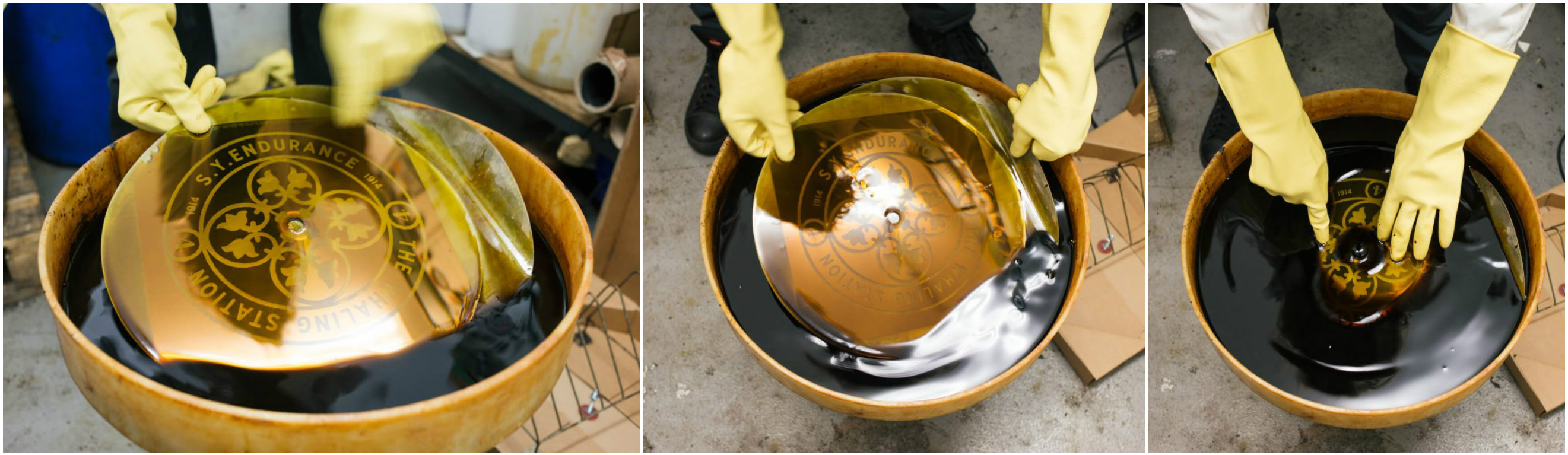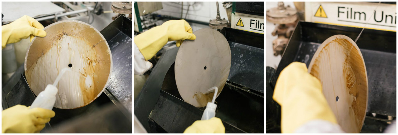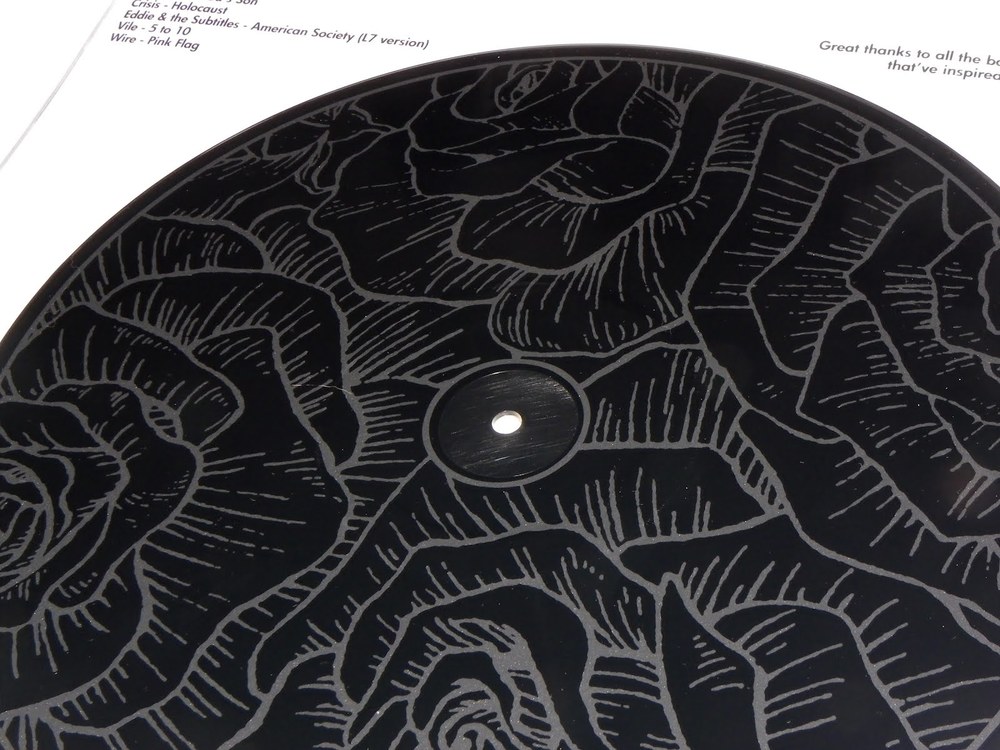 Тем не менее, у винтажной химической гравировки есть неподдельный шарм — это многоэтапная и требовательная процедура сродни мастерству проявки и печати фотографий. Гравировальный элемент наносится на металлический диск с помощью специальных коррозионных химических реакций, затем его впечатывают в винил, который получается односторонним.