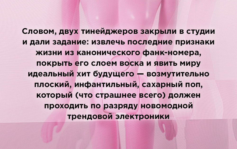 В то время как на осиротевший без своих музыкальных героев сегодняшний день агрессивно напирает прошлое, молодые музыканты вот уже три года играют во все никак не наступающее будущее. В музыку с привязкой future, которая, как футуристические блокбастеры нулевых, уже очень скоро превратится в бесполезный трэш. Под упругий фанковый бас и бойкие духовые группы Rufus молодой Сильвестер Сталлоне вещал с VHS-кассет о том, что «ты можешь проиграть, но должен попытаться». Наши герои не пытаются вовсе. Они даже не электроклэш и не нью-рейв — странные музыкальные конфузы из нулевых — они не претендуют на собственную идентификацию, субкультурные признаки, изобретение новых стилей: XX, YX, что-то там future и какой-нибудь bass. Нет новых стилей — нет перемен. Нет перемен — нет революций. Нет революций — нет будущего, нет настоящего. Зато есть не чувствующие дыхания в спину герои прошлого, которые с легкостью уделывают этих малышей по всем направлениям: от кассовых сборов на концертах до телевизионных и радиоротаций.