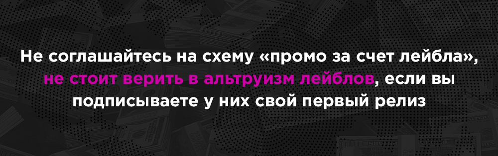 Чаще всего, лейбл берет на себя эти расходы как «серую» статью, просчитать которую вы не сможете. Положим, вы подписали действительно сильный трек, он заработал 1 000 евро. Контракт устроен так: сначала лейбл отбивает свои инвестиции, потом вы делите чистую прибыль. Велика вероятность, что вас просто поставят перед фактом: мы обратились в хорошее PR-агентство, промо-кампания обошлась нам в 1 100 евро, поэтому ты должен нам еще 100. В кулуарах можно услышать много примеров, как гиганты вроде Spinnin’ или Armada выставляют счета своим же резидентам за их релизы. В следующий раз вы будете умнее и потребуете сразу утвердить смету расходов по релизу. И чудо! Лейбл скажет, мол, слушай, не нужна нам лишняя морока, занимайся промоушном сам, какой-то минимум мы, конечно, сделаем.