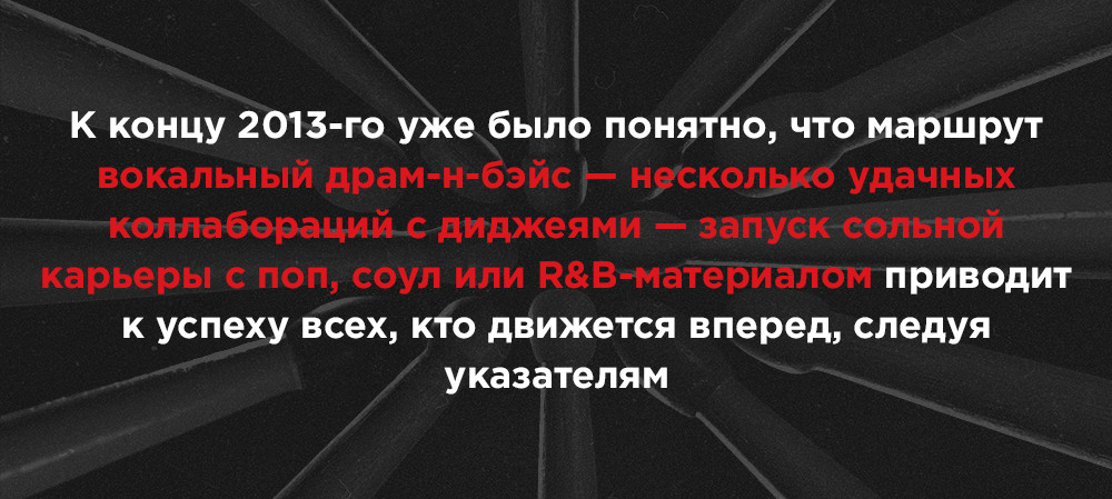 Фанаты насторожились. Да, их любимая музыка давно зависла в промежутке между гимнами фанатских разборок и саундтреками к рекламе туристических компаний, но тут наметился очередной крен в коммерциализацию. Прошел год, свыклись и с этим: в противовес поп-флангу драм-н-бэйс артистов выросла достойная оппозиция в лице молодых, голодных и злобных адептов true-стиля. Казалось, паритет восстановлен. Но в 2012 вышла песня, которая изменила историю стиля.