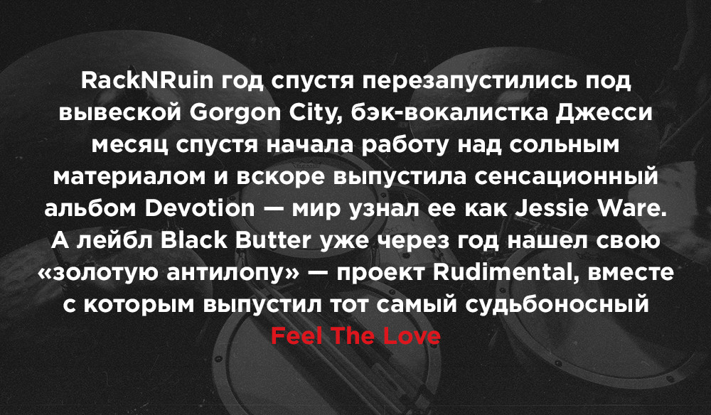 Несколько лет назад Black Butter совершил ключевую сделку в своей истории — получив чек на 7 миллионов долларов, лейбл вошел в структуру Sony. Все основатели сохранили за собой руководящие должности, а в качестве бонуса заимели в вольное распоряжение орудие массового поражения — мировую сеть музыкальной дистрибуции Sony. Rudimental тем временем продолжали оставаться главными «любимчиками» Генри, а в очередь к Black Butter выстроилась армия молодых вокалистов, которые уже усвоили модель пищевой цепочки.