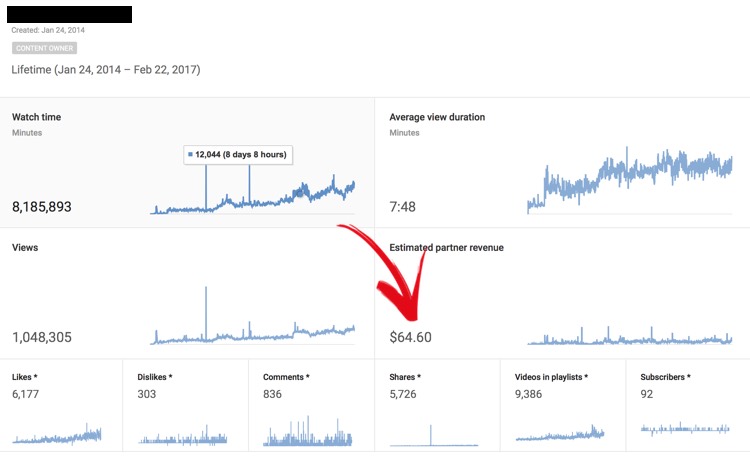 Почти 65 долларов (а точнее 64,60) — именно столько заработал респондент. Банальная арифметика: один просмотр по системе Content ID оценивается YouTube в 0,0000616 цента или 0,0036 рубля (1 048 305 просмотров ÷ 64,60 долларов дохода). Возможно закралась ошибка? Нет: в прошлом году этот же артист получил 27 долларов за почти полмиллиона просмотров (497 734).