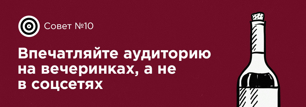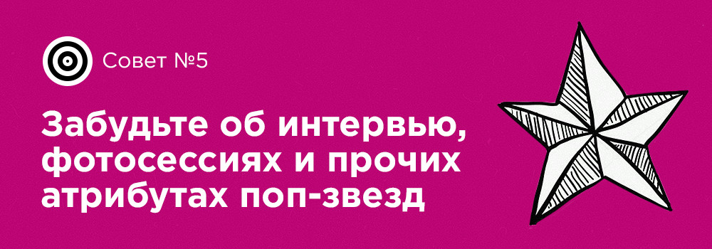 Если вы не политик и не меценат, то уймите свое эго. Я, я, афиша со мной, мой релиз, мой ремикс, мой суп, моя гастроль, мое место в самолете — это быстро утомляет. PR-технологи, которые внимательно следят за трендами в своей профессии, обращают внимание на то, что в 2017-м информации о себе со страниц артиста должно быть не более 40%. Публикуете больше? Это моветон. О чем же тогда писать, спросите вы? О коллегах, о важных и обсуждаемых событиях, о друзьях-музыкантах, обо всех, кто встречается на вашем пути и чем-то помогает. Но тотальная фиксация на себе — путь к гарантированному дизреспекту.