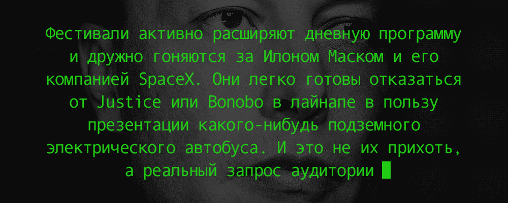 Теперь так: наука и только потом уже музыка. Прежде всего, это касается фестивалей с электронной музыкой, но не только. Зарубежная пресса все чаще прибегает к термину music & tech festivals, а самые прогрессивные издания уже формируют собственные рейтинги подобных мероприятий.