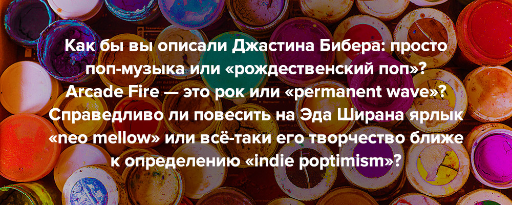 Как бы вы описали Джастина Бибера: просто поп-музыка или «рождественский поп»? Arcade Fire — это рок или «permanent wave»? Справедливо ли повесить на Эда Ширана ярлык «neo mellow» или всё-таки его творчество ближе к определению «indie poptimism»? Почему бы не прозвать нео-гаражный рок, соул и ритм-н-блюз группы Alabama Shakes диковинным «stomp and holler»? А взять, к примеру, Grimes — что же она играет в итоге: «grave wave», «nu gaze», «metropopolis» или все эти три постмодернистских жанра-мутанта сразу? Немудрено, что голова может пойти кругом. Кажется, критики уже давно устали, да и просто потеряли хватку и полёт воображения в изобретении новых жанровых дефиниций, упёрлись во все эти «пост», «бейс», «нео», «модерн» и уже не могут выдать ничего нового. Эти парадоксальные теги должны придумывать бездушные роботы на серверных фермах, а потом навязывать нам через СМИ и музыкальные сервисы, верно? Лишь отчасти, этому есть более прозаичное, но всё равно увлекательное объяснение.