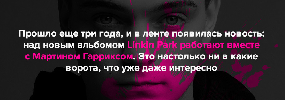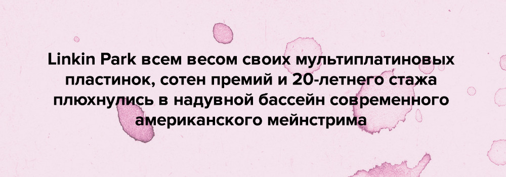 Спустя 20 лет карьеры на рок-сцене Linkin Park зашли в тупик, вдохновившись примерами «легкого успеха» Дэвида Гетты и героев американского EDM-бума. Можно это назвать случайностью? Отчасти. В 2001 году их мультиплатиновый Hybrid Theory, на неподдельную мощь и ярость которого мы, подростки, тогда так легко купились, был самой что ни на есть поп-музыкой: грамотно выстроенной мимикрией под рок-н-ролл; бойз-бэндом с гитарами; идеальной шоу-бизнес конструкцией, которая охватила аудиторию, что не поддается обаянию смазливых артистов из радиочартов. Обозреватели и критики ставили Hybrid Theory четверки и тройки, рекомендуя подросткам слушать что-то более «трушное», раз уж они выбрали для себя альтернативный рок: Deftones, Tool, Korn, в конце концов. Рекомендации эти были направлены в пустоту, молодежь заглатывала наживку, делая выбор в пользу фейка Linkin Park, Papa Roach, P.O.D.