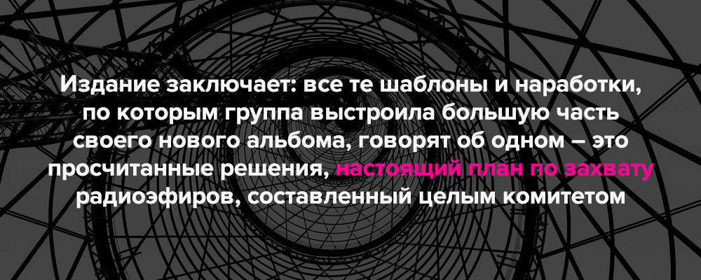 Другое дело, что план этот продуман лишь отчасти. В нью-йоркской компании Radio Adversting Bureau, анализирующей трафик американских радиостанций для крупных артистов, дали свой комментарий о резонансном релизе: «Проблема в том, что со своим новым саундом группа приходит на уже перенасыщенный рынок, внутри которого, к тому же, кризис новых идей и решений. Более того, в новом амплуа у них нет никаких преимуществ перед ведущими диджеями и вокалистами, с которыми им теперь придется конкурировать».