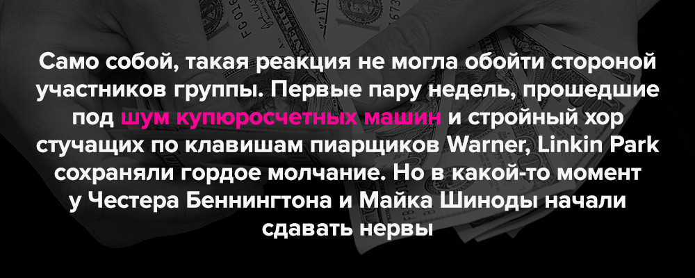 В интервью Music Week журналист в ходе обсуждения напрямую обвинил Честера в продажности. Вокалист сорвался с цепи, предложив всем, кто так думает, «у**ть самих себя по лицу и пойти на х** со своими нравоучениями». Несколько дней спустя в интервью культовому метал-журналу Kerrang!, отвечая на тот же вопрос, Беннингтон решил обратиться ко всем: «Если услышу от кого-то подобное, я в***у его прямо в его е***ный рот. Долбанные вы п***ы».