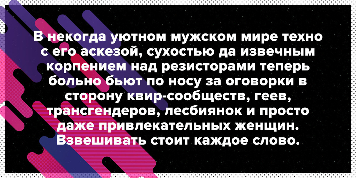 Опустил фейдер диджей-мужчина или нет; можно ли продолжать гастролировать беременным женщинам-диджеям, может ли натурал назвать трансгендера she-man или так шутить над трансгендером могут только другие трансгендеры? Все это, как сказал бы классик, «проблемы белых людей».