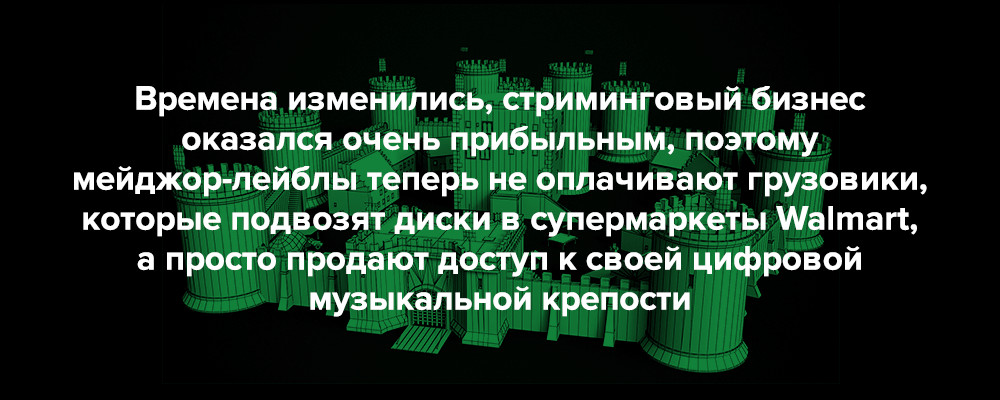 Единственный момент, омрачающий всю эту ситуацию — это напряженная динамика отношений между стриминговыми сервисами, которые дают новую жизнь песням в диджитал-эпоху, и правообладателями в лице крупных лейблов. Около 80 процентов всей записанной музыки в мире принадлежит медиаконгломерату Vivendi, это так называемая большая тройка лейблов в лице Sony, Universal и Warner Music.