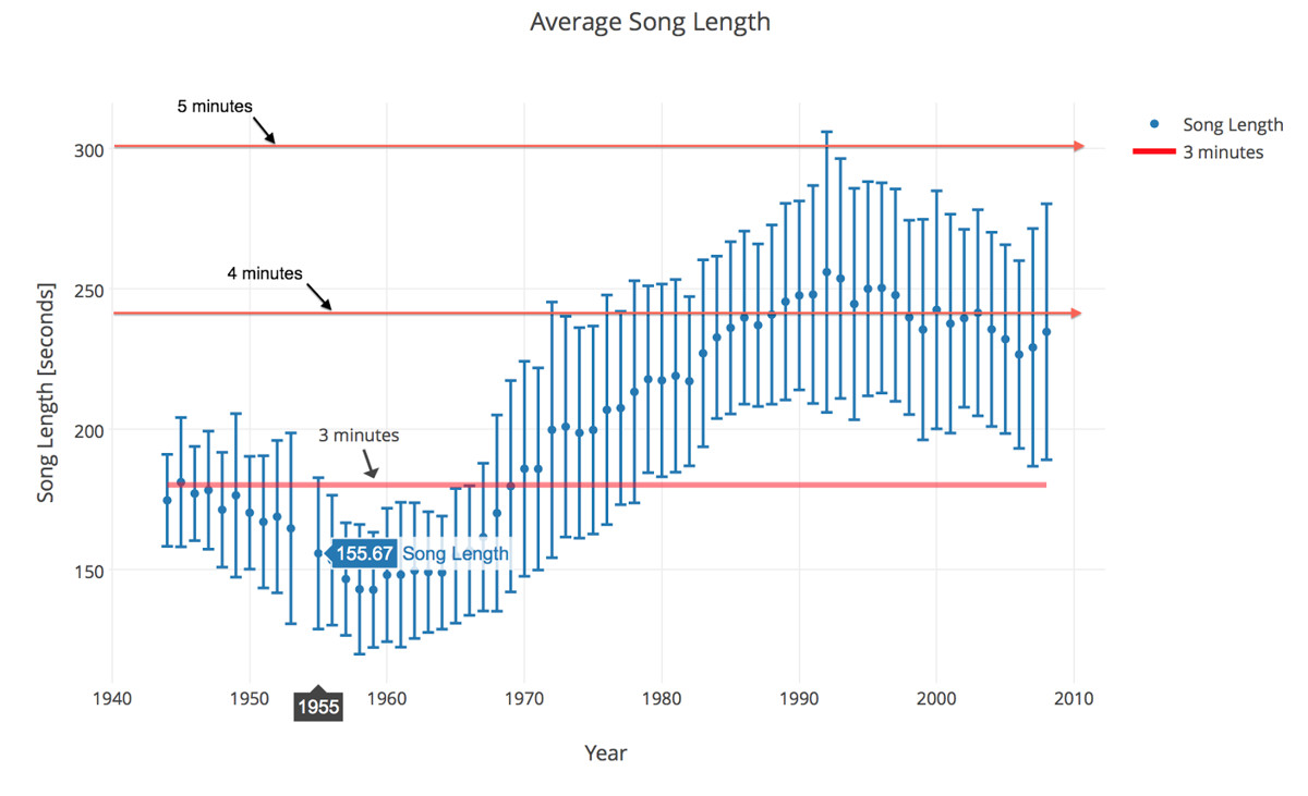 The Beatles рассказывали, как проверяли разные структуры (и длины) песни на живой аудитории, прежде чем находили оптимальный вариант. Трехминутная композиция с проигрышем идеально подходит для совместного пения с фанатами. Иными словами, продолжительность песен от 3 до 3,5 минут связана с песенной структурой, которая оказала серьезное влияние на музыкальную индустрию и считается стандартной формулой. Она выглядит следующим образом: куплет — припев — второй куплет — второй припев — проигрыш — третий припев.