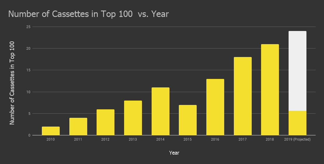 1,8% всех продаж на Discogs в 2018-м — это аудиокассеты в количестве около 200 000 экземпляров. По сравнению с 2017 годом — это прирост на 24%. К тому же большинство из наиболее дорогих кассет были проданы как раз 2017-м и 2018-м